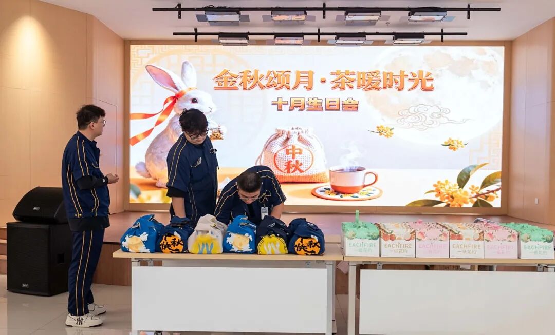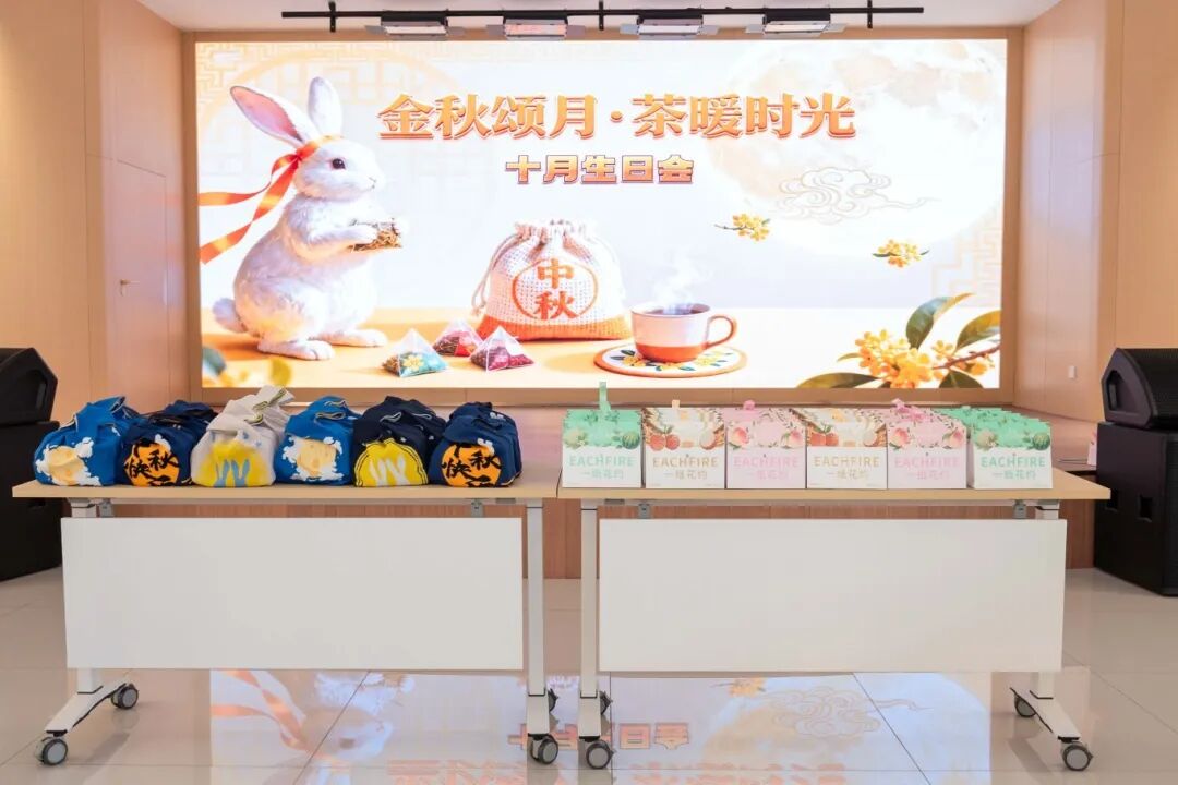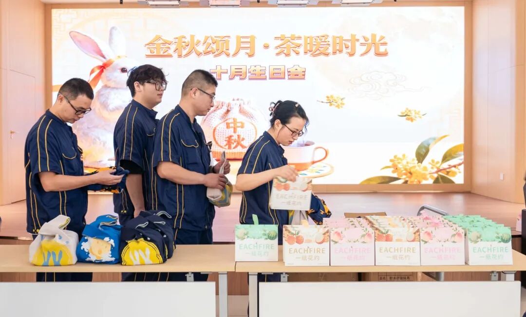 十月的溫柔,藏在金旺生日會的每一處細節(jié)里。餐桌中央,金黃的麥穗與橙紅小菊錯落點綴,與暖色調(diào)的桌布相映成趣,仿佛將整個秋天的豐饒與絢爛都搬進了室內(nèi)。大屏幕上,定制海報以秋葉為襯,寫有對所有壽星的祝福——季節(jié)的靜美與儀式的莊重,在這一刻巧妙相融。隨著生日歌緩緩響起,承載著甜蜜的定制小蛋糕鋪滿餐臺,寓意著員工與金旺智能共同成長的豐碩成果。為壽星們精心準備的生日禮物已經(jīng)在一旁擺好,既是 期許 也是 陪伴 。