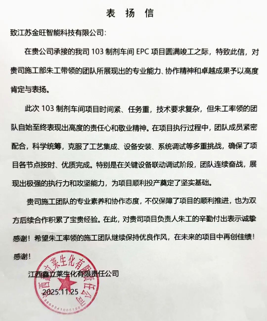 近日,由我司承接的江西85項(xiàng)目(103制劑車間EPC項(xiàng)目)順利竣工,并贏得客戶的高度認(rèn)可與贊譽(yù)。江西鑫立萊生化有限責(zé)任公司特地發(fā)來 表揚(yáng)信 ,對朱工帶領(lǐng)的施工團(tuán)隊(duì)在項(xiàng)目中展現(xiàn)出的專業(yè)能力、敬業(yè)精神與卓越成果予以充分肯定。