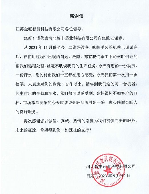 以客戶為中心,重視客戶需求,全力以赴,使命必達(dá)的高品質(zhì)服務(wù),是金旺智能一向的追求。踏至紛來的感謝信也證明了金旺智能的言行一致。