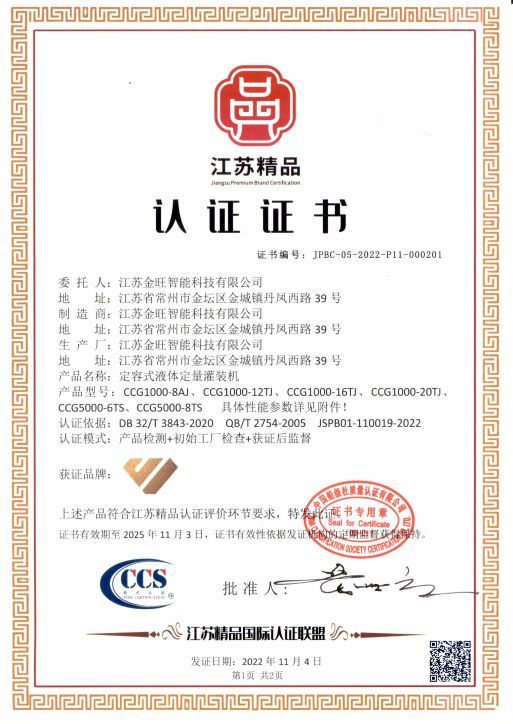日前,從“江蘇精品”國(guó)際認(rèn)證聯(lián)盟傳來(lái)喜訊,金旺智能科技有限公司憑借自主研發(fā)生產(chǎn)的“定容式液體灌裝機(jī)”產(chǎn)品榮獲“江蘇精品”認(rèn)證,這是該系列產(chǎn)品獲得的又一項(xiàng)重量級(jí)榮譽(yù)。
