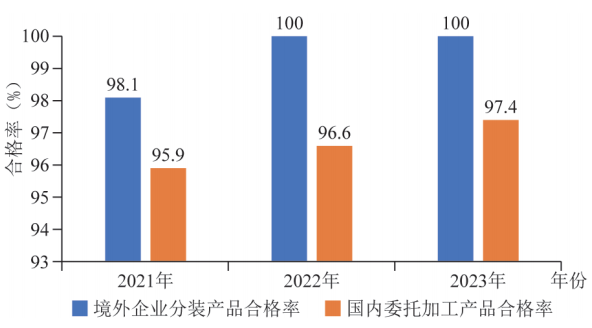 委托加工,是指由委托方提供原料和主要材料(或由受托生產(chǎn)單位自行采購原料),受托方按照委托方要求加工貨物并收取加工費的市場行為?!掇r(nóng)藥管理條例》(簡稱《條例》)修訂前禁止農(nóng)藥委托加工(可以分裝)。為推動農(nóng)藥產(chǎn)業(yè)資源共享,促進產(chǎn)業(yè)發(fā)展向大向強,2017年新修訂《條例》設(shè)立農(nóng)藥委托加工與分裝規(guī)定,委托方人只要取得農(nóng)藥登記證,就可以委托加工相應的農(nóng)藥,鼓勵新農(nóng)藥創(chuàng)制研發(fā)、盡快轉(zhuǎn)化成生產(chǎn)力;受托方人需要取得相應的農(nóng)藥生產(chǎn)許可證即可。農(nóng)藥委托加工相關(guān)規(guī)定對農(nóng)藥生產(chǎn)集約化、專業(yè)化,推動生產(chǎn)企業(yè)兼并重組起到了促進作用。通過6年多的實施,基本上達到了該項制度的立法目的,但有部分企業(yè)借委托加工與分裝之名,從事轉(zhuǎn)讓、出租、出借農(nóng)藥登記證活動,擾亂了農(nóng)藥市場秩序,亟待按照立法本意予以規(guī)范。根據(jù)《農(nóng)業(yè)農(nóng)村部辦公廳關(guān)于2021年農(nóng)藥監(jiān)督抽查結(jié)果的通報》公布的數(shù)據(jù),2021年抽查境外企業(yè)分裝產(chǎn)品54個,合格53個,不合格1個(系假冒農(nóng)藥登記證號),合格率98.1%;抽查國內(nèi)委托加工產(chǎn)品1,147個,合格1,100個,合格率95.9%,國內(nèi)委托加工產(chǎn)品合格率比境外企業(yè)分裝產(chǎn)品合格率低了2.2個百分點,在不合格的47個國內(nèi)委托加工產(chǎn)品中,有26個產(chǎn)品被標稱企業(yè)確認為假冒產(chǎn)品?!掇r(nóng)業(yè)農(nóng)村部辦公廳關(guān)于2022年農(nóng)藥監(jiān)督抽查結(jié)果的通報》公布的數(shù)據(jù)顯示,2022年抽查境外企業(yè)分裝產(chǎn)品31個,合格31個,合格率100%;抽查國內(nèi)委托加工產(chǎn)品1,030個,合格995個,合格率96.6%;國內(nèi)委托加工產(chǎn)品合格率比境外分裝產(chǎn)品合格率低3.4個百分點。根據(jù)《農(nóng)業(yè)農(nóng)村部辦公廳關(guān)于2023年農(nóng)藥監(jiān)督抽查結(jié)果的通報》公布的數(shù)據(jù),2023年抽查境外企業(yè)分裝產(chǎn)品34個,合格34個,合格率100%;抽查國內(nèi)委托加工產(chǎn)品908個,合格884個,合格率97.4%;國內(nèi)委托加工產(chǎn)品合格率比境外企業(yè)分裝產(chǎn)品合格率低了2.6個百分點(圖1)。