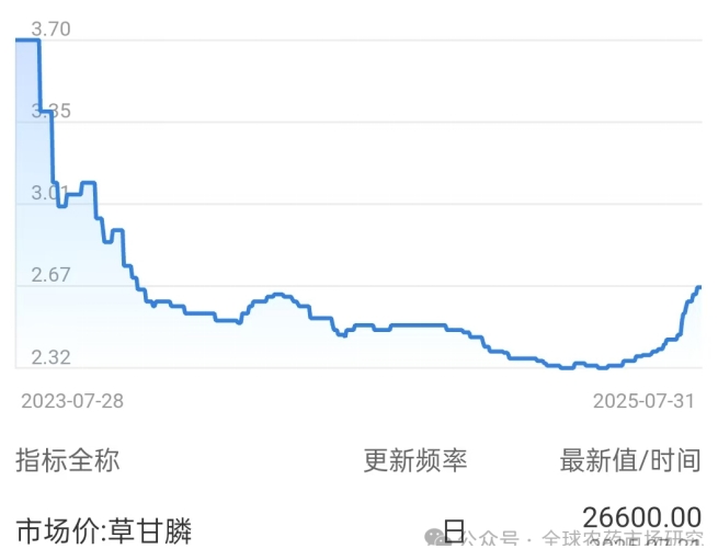 (1)原料成本攀升:甘氨酸、黃磷等原料受環(huán)保限產(chǎn)、水電供應(yīng)波動影響價格大漲,中小產(chǎn)能因虧損被迫停車,行業(yè)開工率持續(xù)走低。