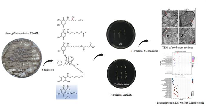 該團(tuán)隊篩選到一株對多種單子葉和雙子葉雜草具有顯著除草活性的棘孢曲霉TE-65L,從其發(fā)酵產(chǎn)物中獲得了5個新型山梨素類化合物。通過波譜分析光譜計算,確定了該類化合物的化學(xué)結(jié)構(gòu),并首次發(fā)現(xiàn)了其對雜草的除草活性,其中2個化合物能夠顯著抑制牛筋草胚芽和胚根的伸長,其活性均強(qiáng)于陽性藥草甘膦。研究表明,該類化合物能夠誘導(dǎo)木質(zhì)素生物合成途徑,導(dǎo)致木質(zhì)素積累,并引起雜草種子細(xì)胞壁增厚,抑制雜草的生長。該研究獲得了具有自主知識產(chǎn)權(quán)的天然除草劑分子模板,擴(kuò)展了天然產(chǎn)物除草劑的結(jié)構(gòu)類型,拓寬了山梨素類化合物的農(nóng)業(yè)應(yīng)用途徑。