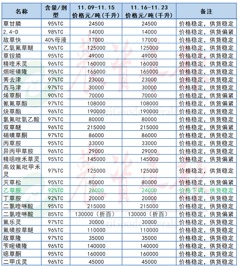 上周(11月16~23日),農(nóng)藥市場(chǎng)整體保持相對(duì)偏弱,交投低迷,產(chǎn)品價(jià)格波動(dòng)不大,穩(wěn)定為主,市場(chǎng)觀望情緒較濃,上游廠家有一定的庫存,部分產(chǎn)品市場(chǎng)以消耗庫存為主;少數(shù)產(chǎn)品廠家開工低下,市場(chǎng)貨源偏緊,價(jià)格保持相對(duì)堅(jiān)挺;部分產(chǎn)品市場(chǎng)需求極度疲軟,價(jià)格出現(xiàn)走弱的趨勢(shì);當(dāng)前上游生產(chǎn)商、渠道商以及下游終端保持謹(jǐn)慎策略,按需采購為主。