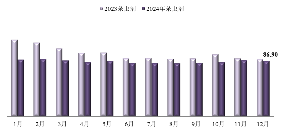 12月,殺蟲劑價格指數(shù)為86.90,環(huán)比下跌1.35%,同比下跌3.31%。監(jiān)測在內(nèi)的34種殺蟲劑產(chǎn)品中,加權(quán)平均成交價格環(huán)比上漲的21種,環(huán)比持平的1種,環(huán)比下跌的12種;加權(quán)平均成交價格同比上漲的10種,同比持平的2種,同比下跌的22種。