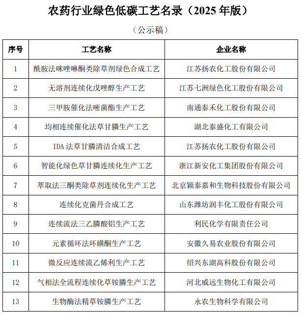 為響應(yīng)國家關(guān)于實現(xiàn)碳達峰和碳中和目標,貫徹落實《“十四·五”全國農(nóng)藥產(chǎn)業(yè)發(fā)展規(guī)劃》,推進實施《農(nóng)藥行業(yè)綠色提升行動計劃》,促進農(nóng)藥行業(yè)的綠色化、低碳化發(fā)展,中國農(nóng)藥工業(yè)協(xié)會將自2021年起授予的中國農(nóng)藥工業(yè)協(xié)會科學(xué)技術(shù)獎中,篩選符合綠色低碳要求的生產(chǎn)工藝,以期為行業(yè)的高質(zhì)量發(fā)展提供示范引領(lǐng)。經(jīng)研究,擬將“酰胺法咪唑啉酮類除草劑綠色合成工藝”“無溶劑連續(xù)化戊唑醇生產(chǎn)工藝”“三甲胺催化法嘧菌酯生產(chǎn)工藝”“均相連續(xù)催化法草甘膦生產(chǎn)工藝”“IDA法草甘膦清潔合成工藝”“智能化綠色草甘膦連續(xù)化生產(chǎn)工藝”“萃取法三酮類除草劑連續(xù)化生產(chǎn)工藝”“連續(xù)化克菌丹合成工藝”“連續(xù)流法三乙膦酸鋁生產(chǎn)工藝”“元素循環(huán)法環(huán)磺酮生產(chǎn)工藝”“微反應(yīng)連續(xù)流乙烯利生產(chǎn)工藝”“氣相法全流程連續(xù)化草銨膦生產(chǎn)工藝”“生物酶法精草銨膦生產(chǎn)工藝”等13項工藝列入《農(nóng)藥行業(yè)綠色低碳工藝名錄(2025年版)》?,F(xiàn)予以公示,公示期為2025年1月20日至1月26日。