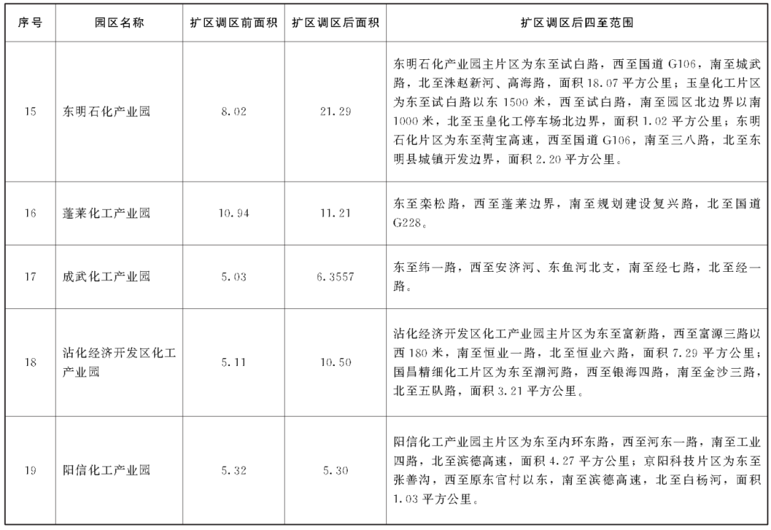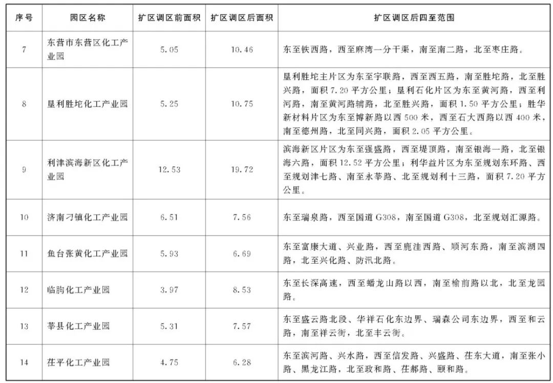 2022年10月,山東省政府辦公廳印發(fā)了《山東省化工園區(qū)擴(kuò)區(qū)管理辦法(試行)》,已試行兩年多時(shí)間。今年1月7日,山東省公布了最新修訂的《山東省化工園區(qū)擴(kuò)區(qū)調(diào)區(qū)管理辦法》。新辦法將擴(kuò)區(qū)條件由12條增加至16條,在規(guī)劃、產(chǎn)業(yè)、安全、環(huán)保、用水等方面加嚴(yán)了標(biāo)準(zhǔn)要求,并對(duì)綜合評(píng)價(jià)、主導(dǎo)產(chǎn)業(yè)、畝均效益、土地利用等指標(biāo)數(shù)據(jù)進(jìn)行了適度提升。同時(shí),新辦法新增了調(diào)區(qū)章節(jié),將調(diào)區(qū)和擴(kuò)區(qū)進(jìn)行了區(qū)分,對(duì)只進(jìn)行局部?jī)?yōu)化調(diào)整未增加土地面積的調(diào)區(qū)情形,單設(shè)了標(biāo)準(zhǔn)條件,對(duì)部分經(jīng)濟(jì)指標(biāo)不再作硬性規(guī)定。