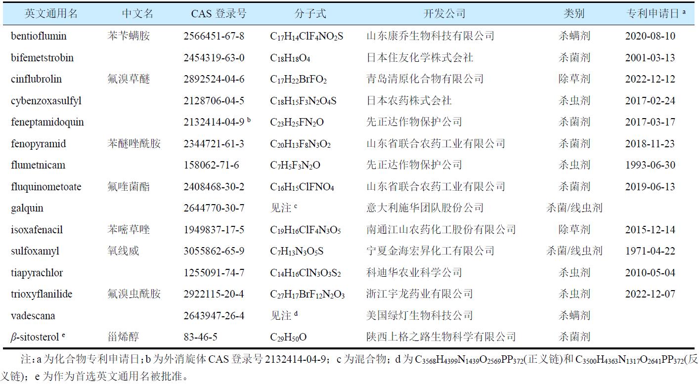 2024年ISO批準(zhǔn)并公布的來(lái)自中國(guó)、日本、美國(guó)、瑞士和意大利農(nóng)藥公司申請(qǐng)的15種農(nóng)藥新品種的英文通用名(表1),涉及殺蟲(chóng)/螨劑6種、殺菌/線蟲(chóng)劑7種、除草劑2種。其中,8種農(nóng)藥為中國(guó)創(chuàng)制的新品種,具體有殺蟲(chóng)/殺螨劑苯芐螨胺和氟溴蟲(chóng)酰胺,殺菌/線蟲(chóng)劑苯醚唑酰胺、氟喹菌酯、氧線威和甾烯醇,除草劑氟溴草醚和苯嘧草唑。甾烯醇已在中國(guó)注冊(cè)登記和上市銷售,其他產(chǎn)品的產(chǎn)業(yè)化開(kāi)發(fā)和登記應(yīng)用已在開(kāi)展中。