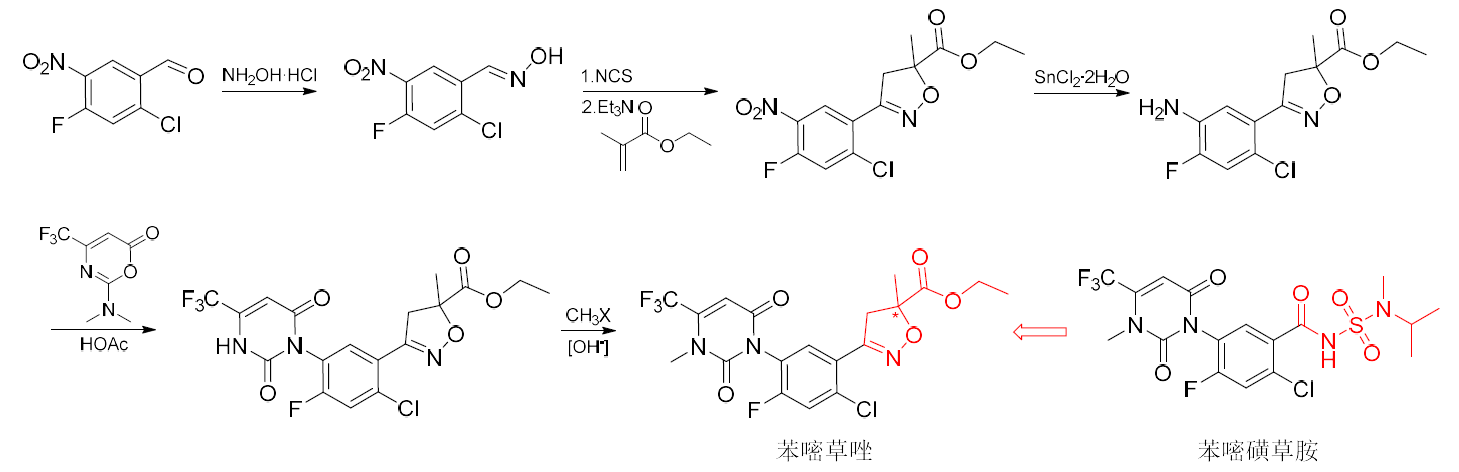 苯嘧草唑(試驗(yàn)代號(hào)SYP-3301、SYP-3356,開(kāi)發(fā)代號(hào)SY-1604、JS-T205)是沈陽(yáng)中化農(nóng)藥化工研發(fā)有限公司采用“中間體衍生化法”經(jīng)過(guò)多輪DSTA(設(shè)計(jì)-合成-測(cè)試-分析)發(fā)現(xiàn)并由南通江山農(nóng)藥化工有限公司獨(dú)家開(kāi)發(fā)的新型除草劑。苯嘧草唑可視為由苯嘧磺草胺(saflufenacil)環(huán)合后進(jìn)一步修飾得到,也屬于原卟啉原氧化酶(PPO)抑制劑。研究結(jié)果表明,苯嘧草唑可制成35%EC和60%WG,對(duì)多種單子葉、雙子葉雜草都具有較高活性,室內(nèi)和田間藥效都優(yōu)于同劑量的苯嘧磺草胺。其中,苯嘧草唑7.5 g/hm2室內(nèi)苗后處理對(duì)2~3葉期稗草、金色狗尾草和4葉期馬唐,2~4葉期百葉草、苘麻和反枝莧,以及5葉期水莎草等雜草都具有70%以上的防效;苯嘧草唑60 g/hm2田間處理對(duì)果園禾本科雜草、闊葉雜草以及全部禾本科和闊葉的田間防效都在61.7%以上。特別地,苯嘧草唑可有效防除抗性牛筋草和小飛蓬,單用或與草甘膦等其他除草劑混用可有效防除小麥、水稻、玉米、大豆、棉花和油菜等作物田間的雜草。先正達(dá)公司于2018年在美國(guó)進(jìn)行的田間試驗(yàn)結(jié)果表明,苯嘧草唑的防效優(yōu)于草銨膦、苯嘧磺草胺、唑草酮和丙炔氟草胺,且對(duì)禾本科雜草防效優(yōu)異。預(yù)計(jì)該除草劑于2025年上市,由開(kāi)發(fā)公司和先正達(dá)公司共同進(jìn)行全球市場(chǎng)開(kāi)發(fā)。苯嘧草唑含有1個(gè)手性中心,對(duì)哺乳動(dòng)物、蜜蜂、鳥(niǎo)類、魚(yú)類、溞類和家蠶的急性毒性較低且易分解,其可能的創(chuàng)制思路和合成路線見(jiàn)圖15,合成可共用苯嘧磺草胺、氟嘧硫草酯(tiafenacil)和epyrifenacil等的關(guān)鍵中間體。