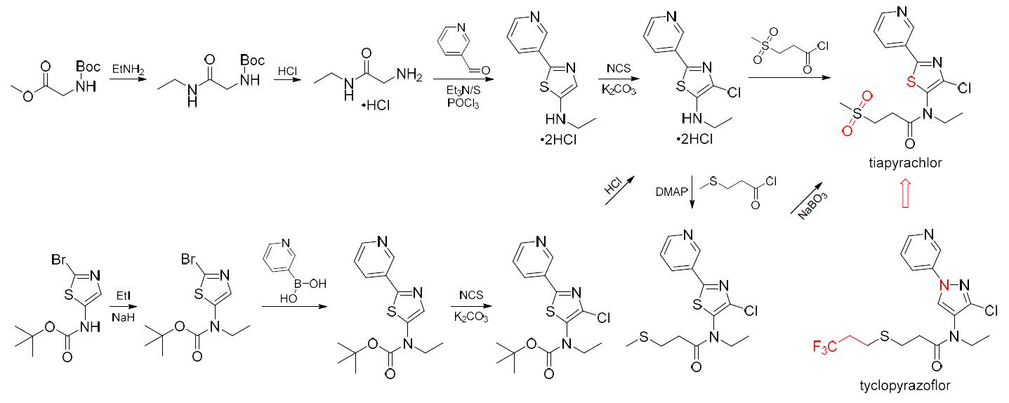Tiapyrachlor(開(kāi)發(fā)代號(hào)X12019747、XR-120和XDE-120)是科迪華公司繼tyclopyrazoflor之后開(kāi)發(fā)的又一吡啶基吡唑酰胺類殺蟲(chóng)劑,可視為用噻唑和甲磺?;鶎?duì)后者進(jìn)行修飾得到。推測(cè)tiapyrachlor的作用機(jī)制與tyclopyrazoflor類同,主要通過(guò)干擾昆蟲(chóng)的神經(jīng)傳遞系統(tǒng)而使昆蟲(chóng)行為失常并最終死亡。與直接或間接作用于弦音器TRPV通道的殺蟲(chóng)劑類同,tiapyrachlor對(duì)刺吸式口器害蟲(chóng)具有突出的選擇活性。室內(nèi)生測(cè)結(jié)果表明,tiapyrachlor 200 mg/L對(duì)無(wú)翅桃蚜成蟲(chóng)、若蟲(chóng)(3 d)和煙粉虱若蟲(chóng)(8~9 d)的殺死率≥80%。進(jìn)一步的研究結(jié)果表明,tiapyrachlor在低劑量時(shí)對(duì)桃蚜(0.078~1.25 mg/L)和煙粉虱(0.01~0.1 mg/L)具有一定殺蟲(chóng)活性,但在400~4,000 mg/L的高劑量時(shí)卻對(duì)西花薊馬、西部牧草盲蝽(Lygus hesperus)、新熱帶棕椿象(Euschistus heros)和甜菜夜蛾的活性較低或沒(méi)有活性,與包括直接或間接作用于弦音器TRPV通道的殺蟲(chóng)劑在內(nèi)的多種殺蟲(chóng)劑混用都具有顯著的增效作用。Tiapyrachlor可能創(chuàng)制思路和2條合成路線見(jiàn)圖4,合成可共用tyclopyrazoflor的中間體。