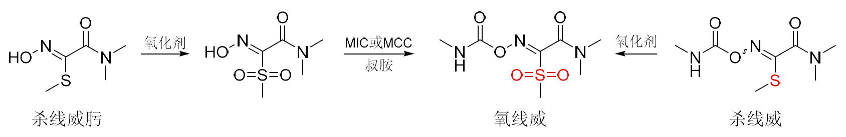 氧線威是由杜邦公司(Dupont,現(xiàn)科迪華公司)最先研究報(bào)道而由中國(guó)公司開(kāi)發(fā)的新型殺線蟲(chóng)劑,可視為由殺線威(oxamyl)進(jìn)一步將硫醚氧化至砜得到。推測(cè)其作用機(jī)制與殺線威一致,為乙酰膽堿酯酶(ACh E)抑制劑。氧線威對(duì)哺乳動(dòng)物低毒,在自然環(huán)境中易水解,其安全性優(yōu)于殺線威。氧線威既可預(yù)防藻菌綱類真菌引起的多種作物病害,也可用于線蟲(chóng)防控。研究結(jié)果表明,南方根結(jié)線蟲(chóng)2齡幼蟲(chóng)的LC50為7.41~12.52 mg/L(24~72 h),90%致死濃度(LC90)為36.84~56.41 mg/L(24~72 h),對(duì)南方根結(jié)線蟲(chóng)卵孵化的半抑制濃度(IC50)和90%抑制濃度(IC90)分別為59.48、510.84 mg/L(7 d),生物活性優(yōu)于殺線威和噻唑膦。氧線威為(Z)-式異構(gòu)體,可由殺線威的關(guān)鍵中間體殺線威肟先氧化后再酯化得到,或直接由殺線威氧化得到(圖12)。