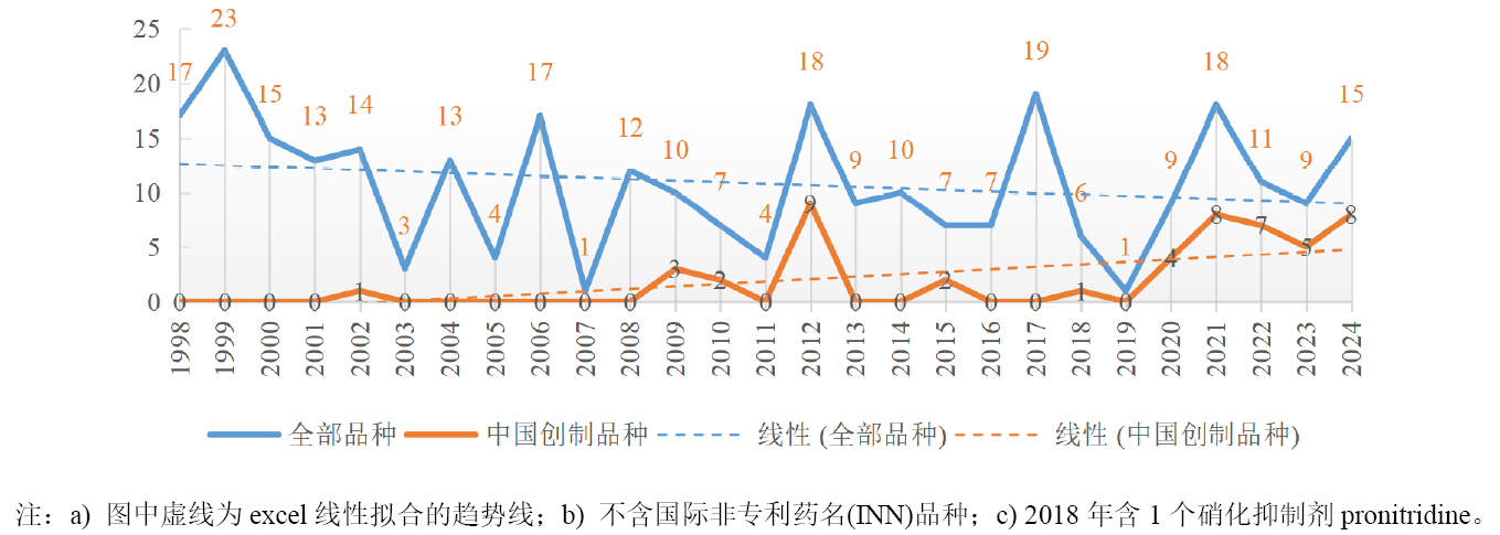 圖16 1998-2024年ISO公布的農(nóng)藥新品種數(shù)量及其趨勢(shì)