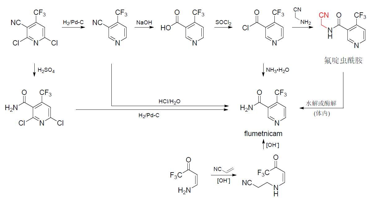 Flumetnicam(文獻(xiàn)代碼TFNA-AM)是由日本石原產(chǎn)業(yè)株式會(huì)社(ISK)最先研發(fā)報(bào)道的殺蟲(chóng)劑,后被證實(shí)也是氟啶蟲(chóng)酰胺在靶標(biāo)害蟲(chóng)體內(nèi)的活化代謝物。據(jù)報(bào)道,flumetnicam具有優(yōu)異的根內(nèi)吸活性,其作用機(jī)制與氟啶蟲(chóng)酰胺相同,為煙酰胺酶抑制劑,即通過(guò)煙酰胺的累積間接激活弦音器瞬時(shí)受體電位香草酸亞型(TRPV)通道發(fā)揮殺蟲(chóng)活性,與吡蚜酮、吡啶喹唑啉、雙丙環(huán)蟲(chóng)酯和嗪蟲(chóng)唑酰胺無(wú)交互抗性或很低交互抗性風(fēng)險(xiǎn)。室內(nèi)生測(cè)結(jié)果表明,flumetnicam在800 mg/L時(shí)對(duì)桃蚜若蟲(chóng)(5 d)和棕櫚薊馬成蟲(chóng)(8 d)的殺死率均為100%。在中國(guó)的進(jìn)一步研究結(jié)果表明,flumetnicam對(duì)桃蚜若蟲(chóng)、水稻褐飛虱若蟲(chóng)和白粉虱1~2齡若蟲(chóng)的半致死濃度(LC50,mg/L)分別為2.62(3 d)、1.51(10~15 d)和1.71(3 d),且與吡蚜酮或螺蟲(chóng)乙酯混用具有顯著的協(xié)同增效作用。由于比氟啶蟲(chóng)酰胺具有更快的擊倒作用,先正達(dá)公司將flumetnicam作為衛(wèi)生殺蟲(chóng)劑進(jìn)行開(kāi)發(fā),相關(guān)研究結(jié)果表明,該殺蟲(chóng)劑可通過(guò)擊倒或食血抑制控制攜帶疾病的或食血性(攝食血液)的蚊、蠅、臭蟲(chóng)和獵蝽等雙翅目、錐獵蝽亞科和臭蟲(chóng)科等多類別衛(wèi)生害蟲(chóng)。然而,埃及伊蚊等昆蟲(chóng)表皮穿透性降低會(huì)降低其對(duì)flumetnicam的敏感性;對(duì)于岡比亞按蚊,flumetnicam與氟啶蟲(chóng)酰胺存在交互抗性,但兩者與氯菊酯都無(wú)交互抗性。在美國(guó)和歐盟等國(guó)家和地區(qū),flumetnicam被作為氟啶蟲(chóng)酰胺在食品中的殘留定義物。Flumetnicam熔點(diǎn)162.7℃,可制成50%WP和WG,可能創(chuàng)制思路和不同合成路線見(jiàn)圖3,合成可共用氟啶蟲(chóng)酰胺的中間體,推測(cè)其生產(chǎn)成本比氟啶蟲(chóng)酰胺低。
