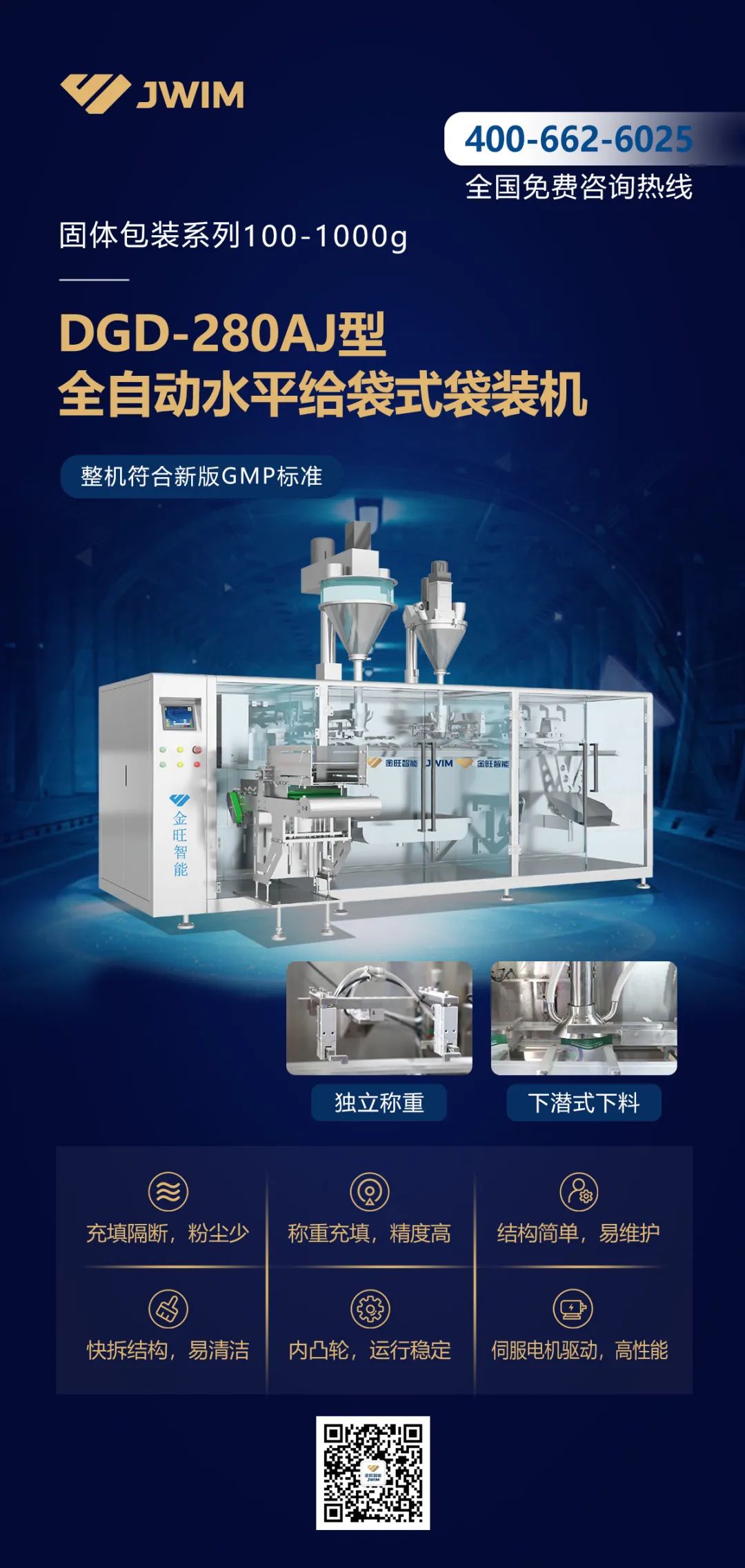 金旺智能按照獸藥GMP標準設(shè)計,為廣大獸藥客戶量身打造適合100-1000g包裝,在線稱重式,DGD-280AJ全自動水平給袋式袋裝機,全力助力獸藥制劑智能化發(fā)展,快速通過新版GMP認證!該機設(shè)計合理,外觀新穎,可換充填器在本機上實現(xiàn)粉劑、散劑、預混劑、顆粒等物料的自動充填。